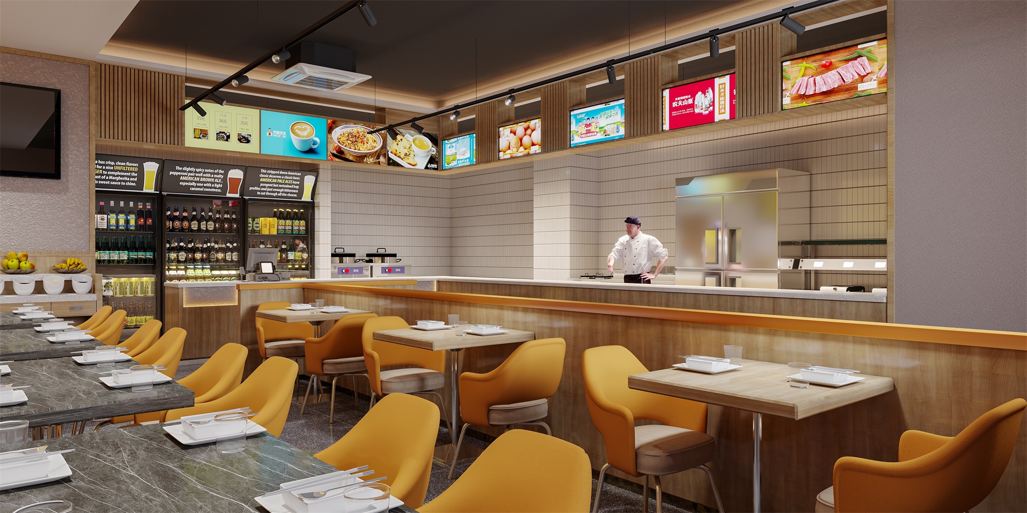 瓦罐先生是一個以傳統瓦罐煨湯江西特色的現代餐飲品牌,主打便捷、健康的煨湯與燜燒菜品。項目位于深圳地鐵站內美食街,總面積60平方米,外擺區10平方米。設計以現代風格為基調,門頭采用高飽和度的橙色軟膜燈箱,在快節奏的地鐵環境中形成強烈視覺記憶點。室內通過暖木色與顆粒感藝術漆的碰撞,平衡工業感與溫馨氛圍;外擺區則利用可折疊家具與綠植墻,靈活適應高峰時段需求。空間布局注重動線優化,明檔廚房結合品牌文化墻,強化“現煨現賣”的新鮮體驗,助力“瓦罐先生”在競爭激烈的美食街中脫穎而出。
